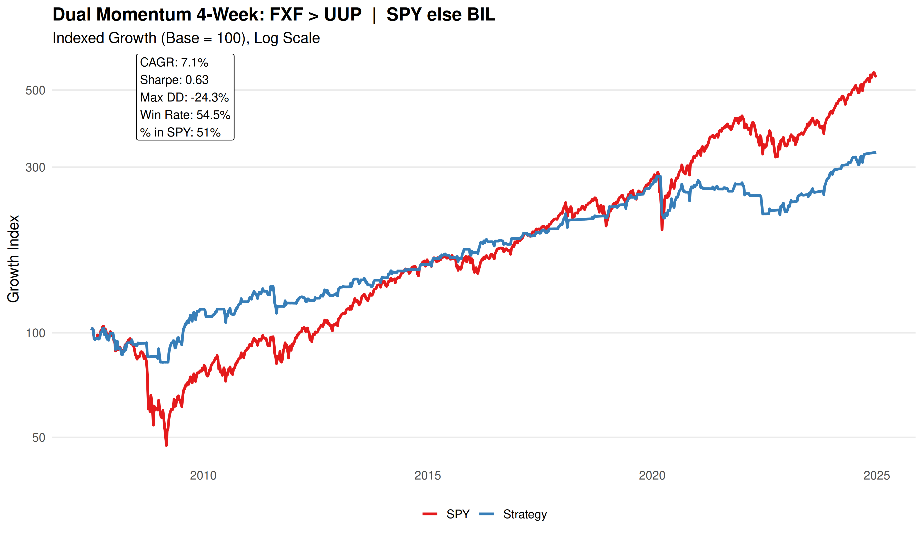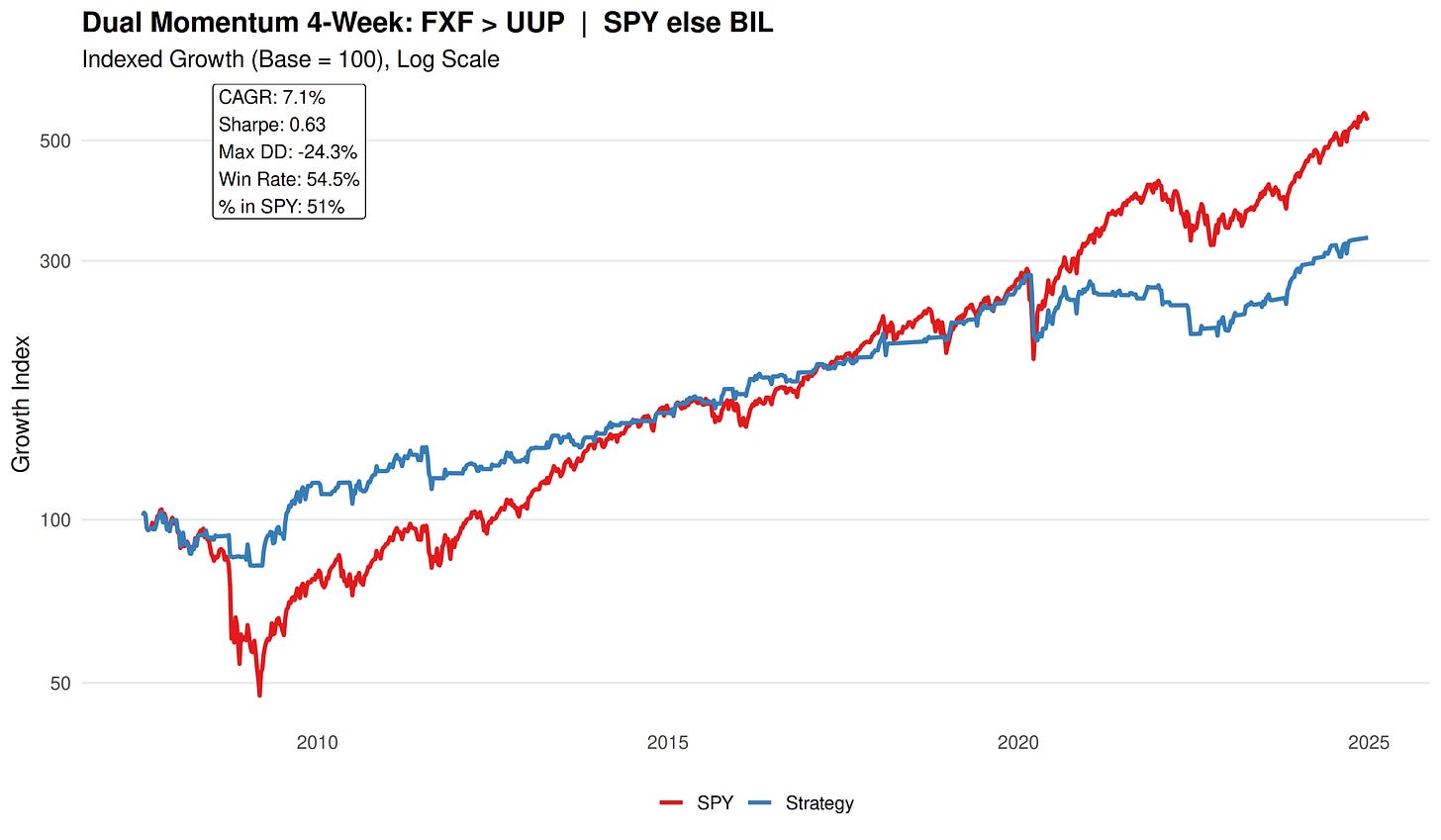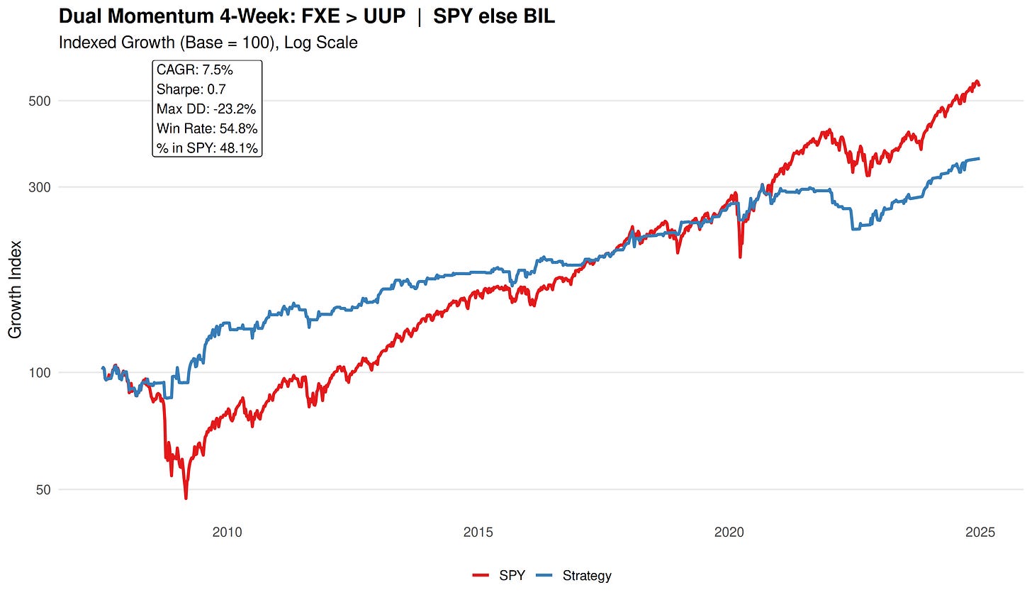 If Currency A’s 4-week return is greater than Currency B’s 4-week return → hold SPY for the next week.