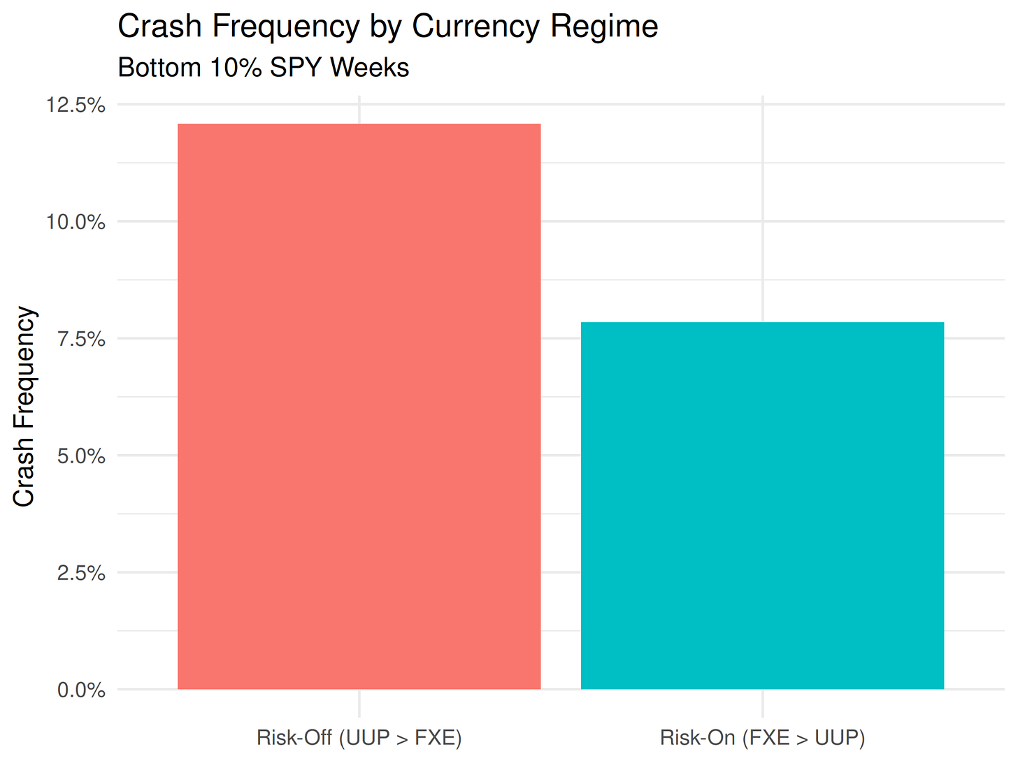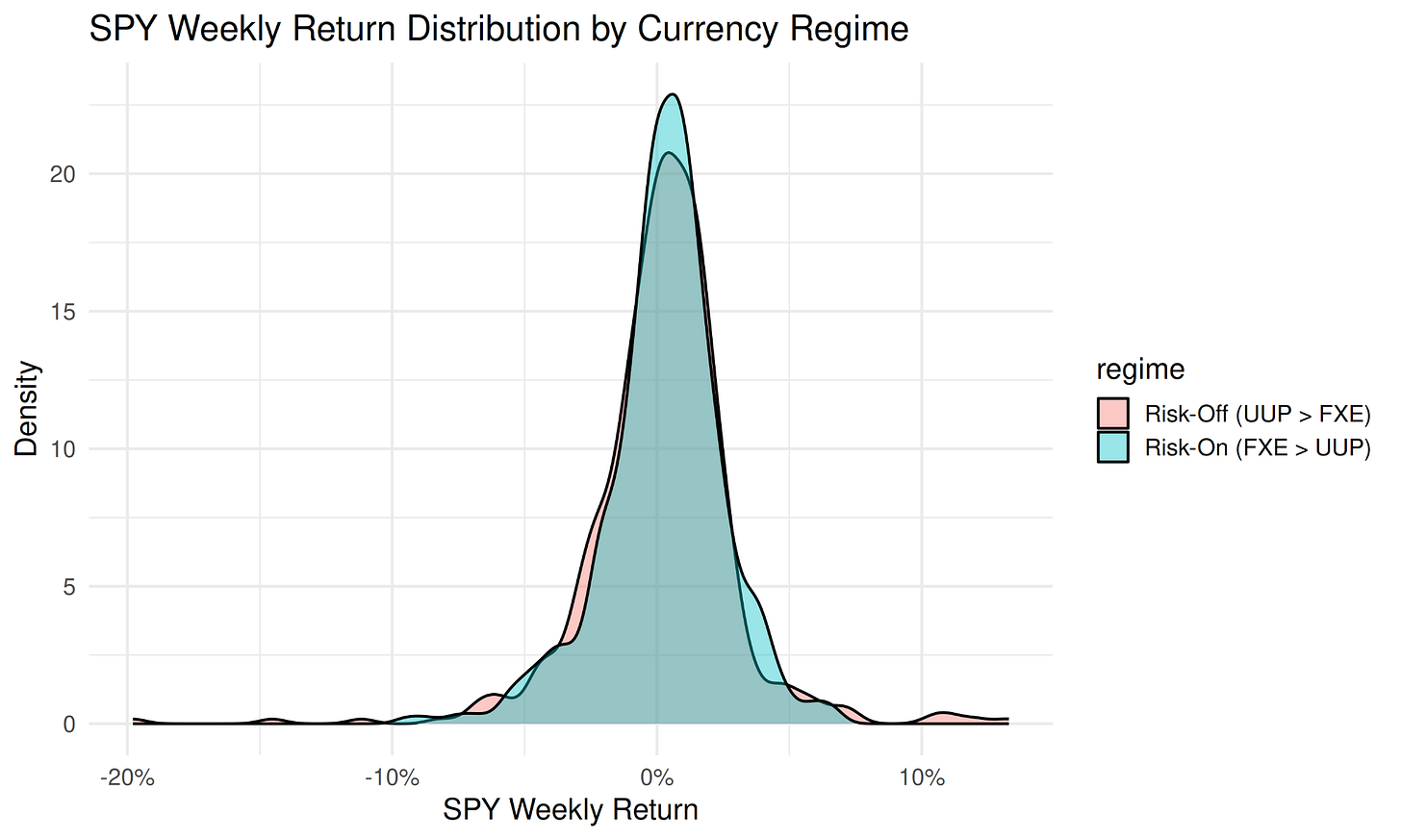 The chart below splits weekly SPY returns into two currency-defined regimes: