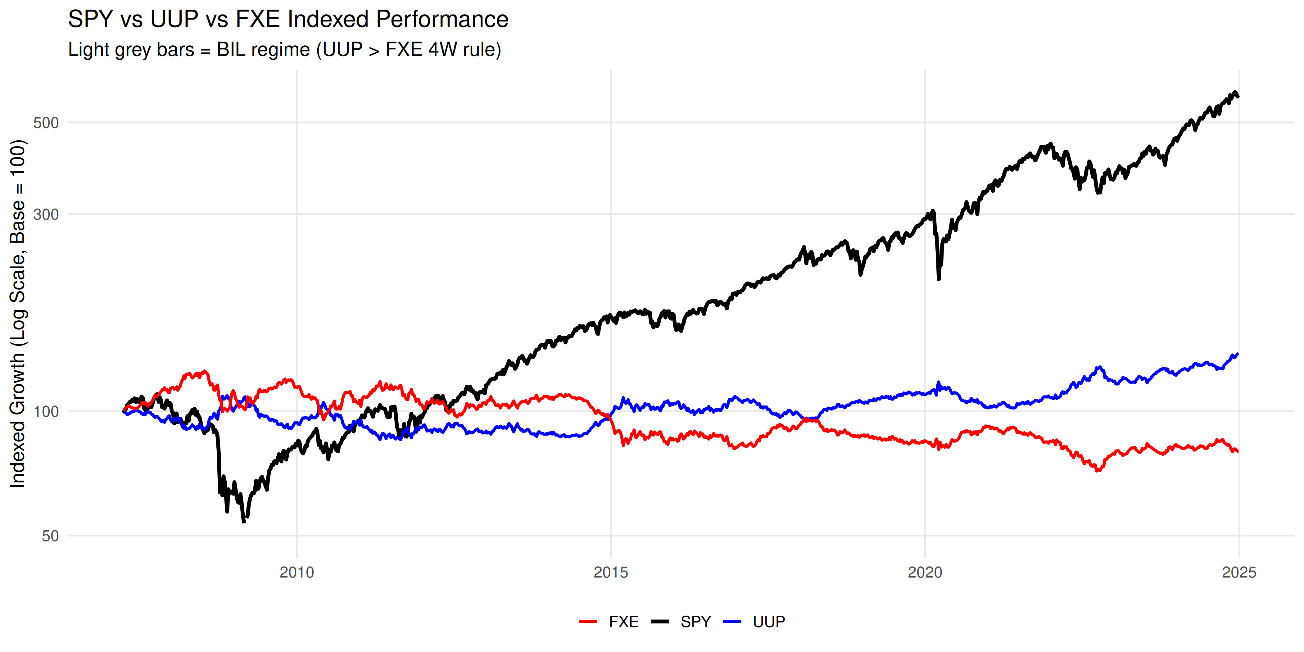 Placed on the same log-scale canvas, SPY compounds powerfully upward over time. UUP oscillates in cycles of strength and retracement. FXE shows the mirror image, early strength followed by structural decline versus the dollar.