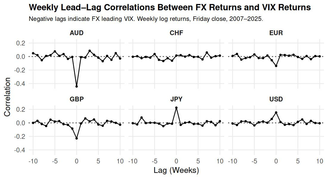 What does persist, across nearly two decades of daily and weekly observations, is something subtler. Same-day currency returns align with same-day volatility regimes in a statistically durable way. That is notable. Foreign exchange and equity derivatives occupy structurally different domains. One would not expect a stable rhythm between them. Yet a rhythm appears.